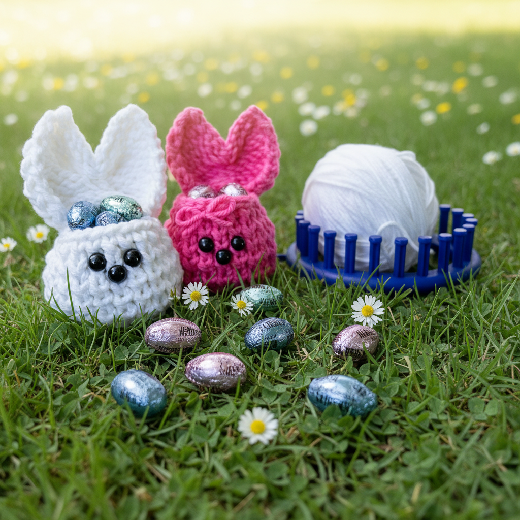 • Load image into Gallery viewer, Loom knit Easter bunny bags copyright Loomahat